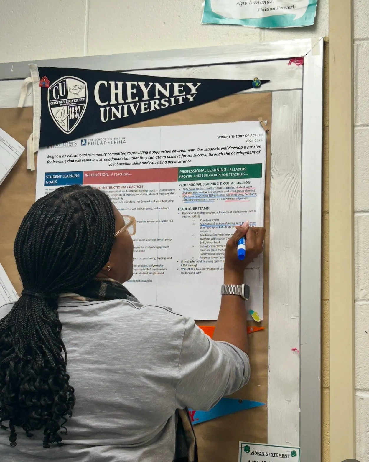 A woman with braided hair and glasses is writing on a document pinned to a bulletin board using a blue marker. She is wearing a gray sweater, a black and white scarf, and a silver watch. The bulletin board is filled with various educational materials, including a Cheyney University pennant, a printed document outlining a "Wright Theory of Action," and a small sign with a Haitian proverb. The setting appears to be a classroom or school office.