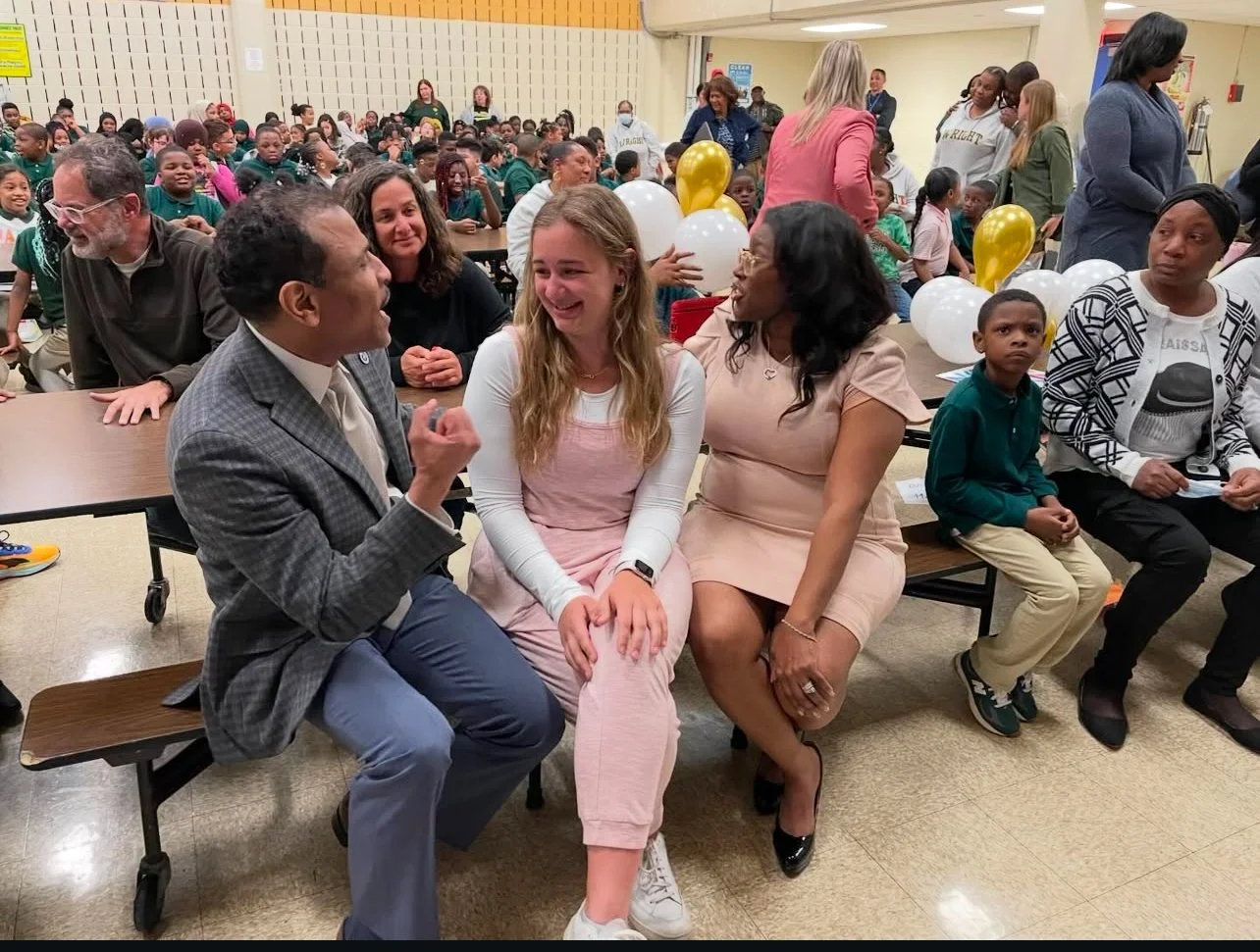 A school event in a cafeteria setting, with rows of students seated in the background. In the foreground, a man in a gray checkered suit is animatedly talking to a young woman in light pink overalls and a white shirt, who is smiling. Two women sitting next to them are listening attentively. The atmosphere is lively, with people chatting and balloons decorating the space.