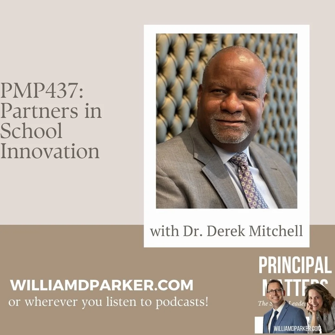 A promotional graphic for episode PMP437 of the "Principal Matters" podcast featuring Dr. Derek Mitchell. The graphic has a beige background with a professional headshot of Dr. Mitchell, a Black man with a gray beard, wearing a gray suit and patterned tie, sitting against a tufted background. The text reads, "PMP437: Partners in School Innovation with Dr. Derek Mitchell." The bottom of the image includes the website "WILLIAMDPARKER.COM or wherever you listen to podcasts!" and the "Principal Matters" podcast logo, which features a photo of the hosts, a man and a woman smiling.