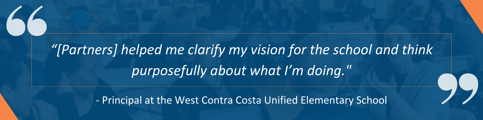 A blue graphic with a testimonial from the Principal at the West Contra Costa Unified Elementary School: “[Partners] helped me clarify my vision for the school and think purposefully about what I’m doing.”