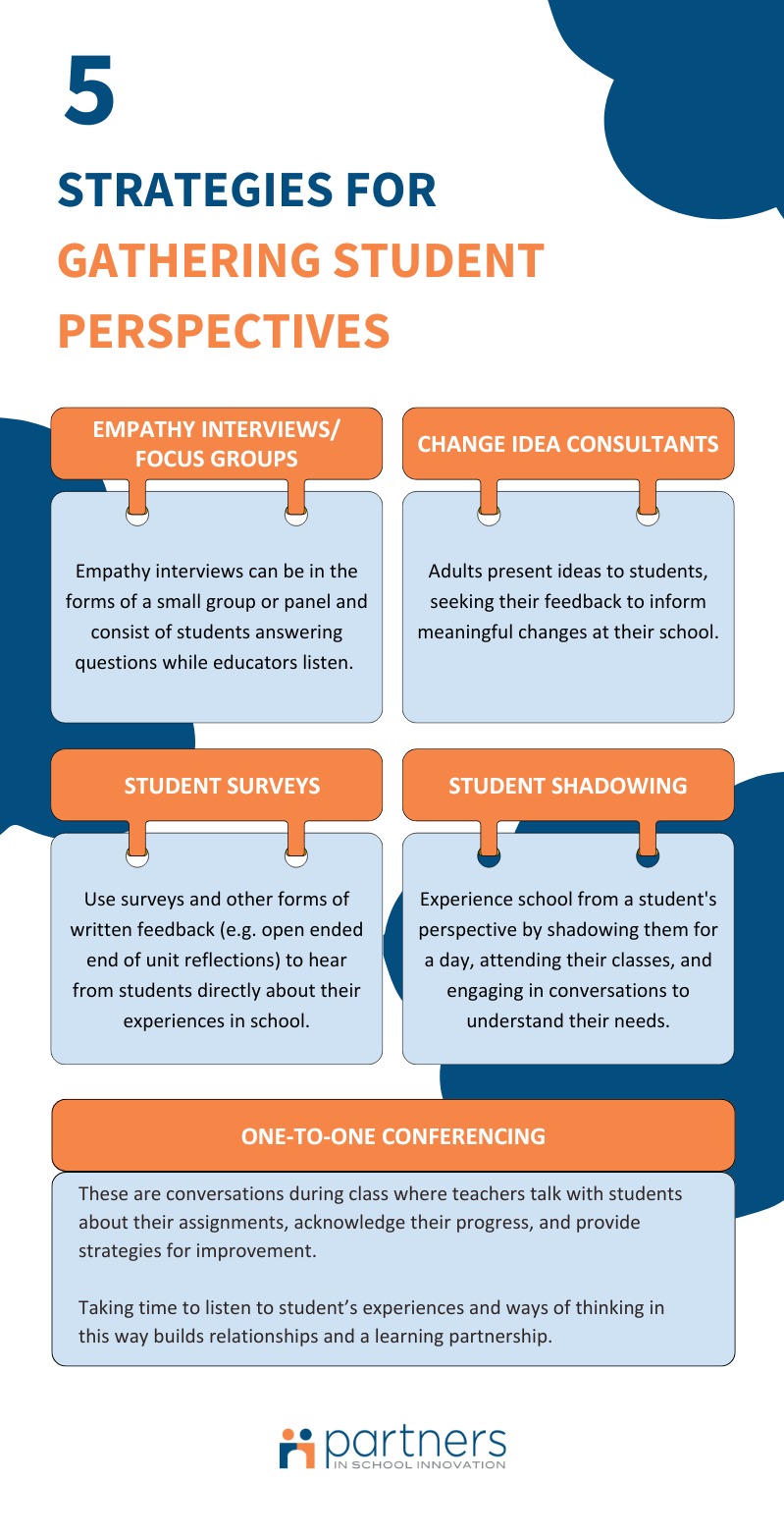 Infographic outlining five strategies for gathering student perspectives, including empathy interviews, change idea consultants, student surveys, student shadowing, and one-to-one conferencing.